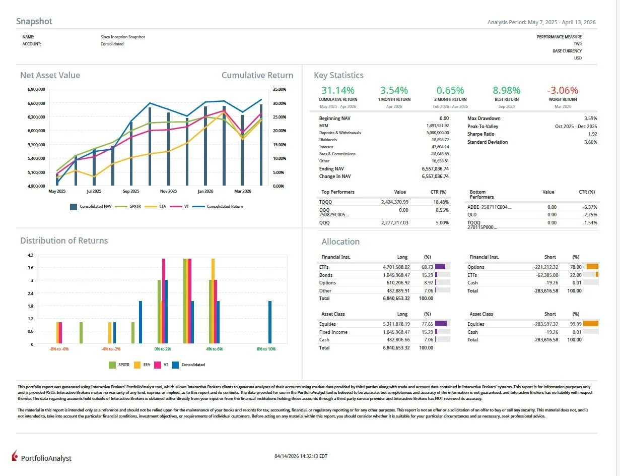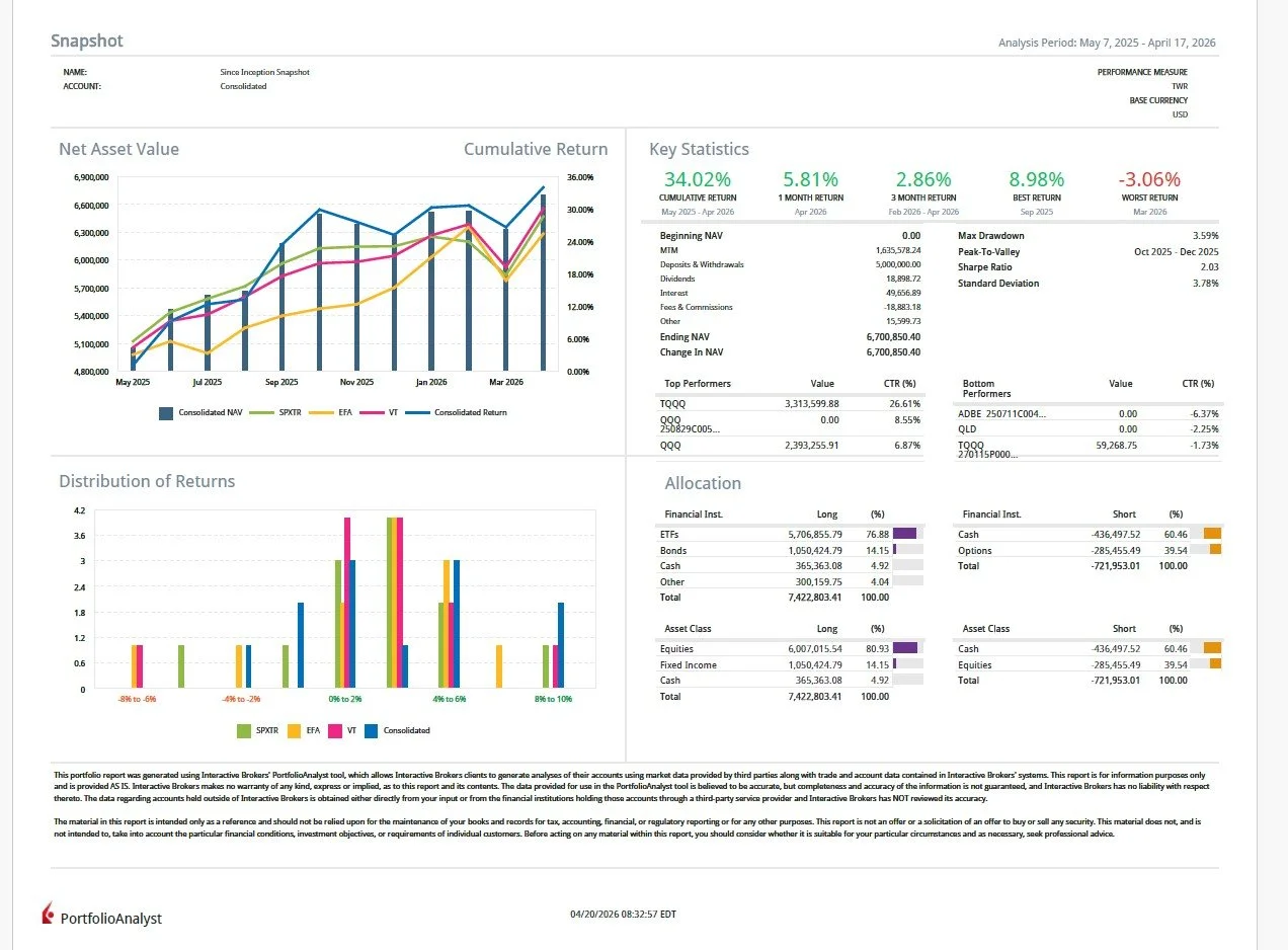 5) Constant Measurement: The firm's portfolio manager continuously evaluates the performance of his portfolios by comparing them to relevant benchmarks, focusing on both risk and return. He leverages key metrics such as Alpha, total return, Sharpe ratio, standard deviation, max drawdowns and correlation to assess how well the portfolio is performing. Additionally, he uses client experience surveys to gather feedback and ensure that the client experience aligns with their expectations. These comprehensive tools help him stay on track and continuously improve his strategy, ensuring he is delivering the best possible results.