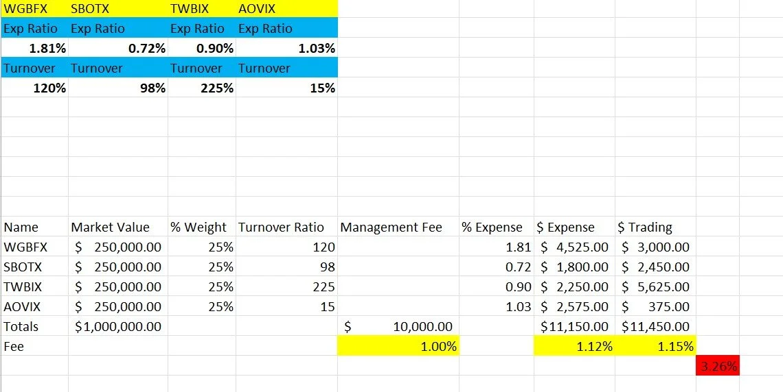 In the Excel example, you may think you’re paying a 1% advisory fee, but once trading costs and mutual fund expense ratios are included, the total cost rises by an additional 2.26%.